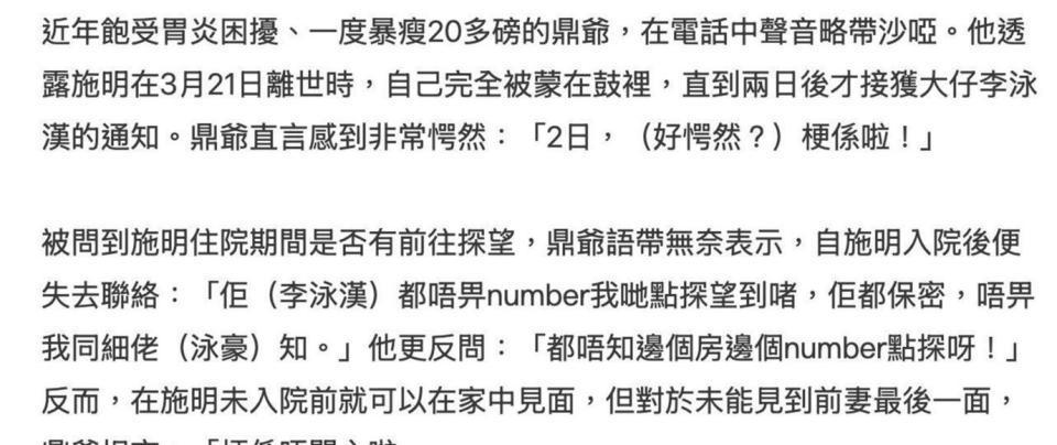 3 月 21 日施明病危去世的时候,身边只有大儿子李泳汉一个人。 按理说,不管是按人情还是按法律,作为曾经一起生活了几十年的老夫妻(两人在 1977 年结婚,1994 年离婚),鼎爷有权第一时间知道这个消息。 但鼎爷在采访里情绪激动地说,他是直到施明去世整整两天后,才接到大儿子李泳汉的电话被告知死讯。